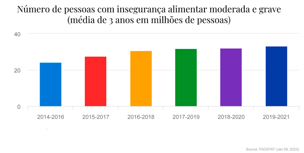 - Apesar do aumento significativo na produção de alimentos no período de 2011 a 2021, e de que no mesmo período a população aumento “apenas” em trono de 40%, o índice de insegurança alimentar ainda é alto, bem como o de subnutrição.