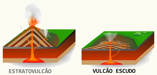 *Um vulcão em escudo é um tipo de vulcão habitualmente constituído quase inteiramente por fluxos de lava fluidos. Os vulcões em escudo são designados deste modo porque a sua forma lembra a de um escudo deitado. A forma é causada pela escorrência da lava altamente fluida durante as erupções, que percorre maiores distâncias do que a lava eruptida a partir de um estratovulcão.