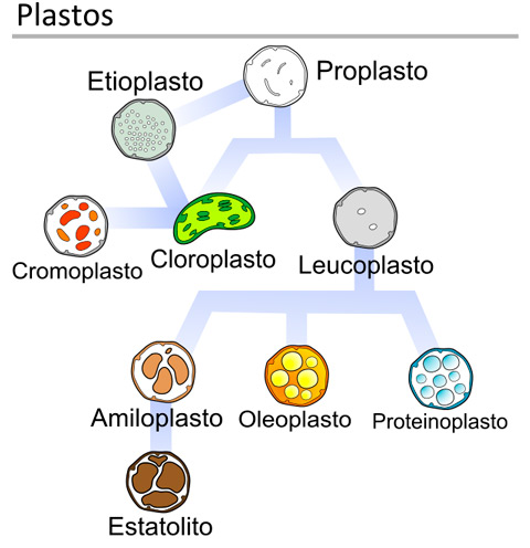 – Leucoplasto: São os plastos incolores que não possuem pigmentos e podem armazenar várias substâncias. Aqueles que armazenam amido são os amiloplastos, ocorrendo, por exemplo, em tubérculos de batatinha inglesa (Solanum tuberosum). Os que reservam proteínas são chamados de proteinoplastos e, os que reservam lipídios elaioplastos (eloplastos). Nos amiloplastos pode se formar um ou vários grãos de amido e o seu sistema de tilacóides é pouco desenvolvido. Expostos à luz os leucoplastos, podem se transformar em cloroplastos novamente.