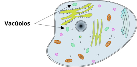 – Vacúolo digestivos: Normalmente são esses vacúolos que estudamos no ensino fundamental. Eles realizam a digestão intracelular e estão presentes em protozoários e em células animais e humanas como os macrófagos. Um exemplo é o envolvimento de uma partícula próxima a membrana celular (fagocitose), formando o fagossomo e unindo-se ao lisossomo formando o vacúolo digestivo. Após aproveitamento por enzimas da parte útil, o resto é descartado da célula. Vírus e bactérias são tratados de forma semelhante no corpo humano por células de defesa.
