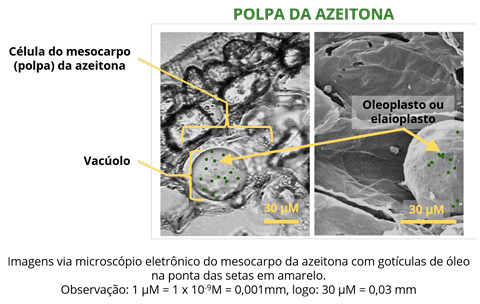 O azeite de oliva é produzido nas células do mesocarpo e armazenado em um tipo particular de vacúolo denominado lipo vacúolo. O tamanho de cada vacúolo é “muito pequeno”, ou seja: cada célula possui uma pequenina gota de azeite.